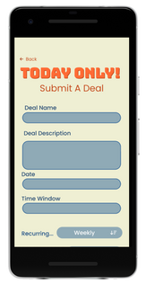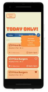 A separate click task was also distributed to seven different participants, asking them to filter by best rated deals, view specials for the following week, and submit a deal to the app. Through this research we determined strengths and pain points of the design.